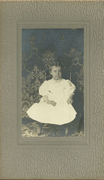 The photo was probably taken about 1907-1908 when Mary was about three or four years of age. The photo itself measures 3-1/8” x 5-3/8” and is mounted on a decorative board measuring 5-1/4” x 8-7/8”.