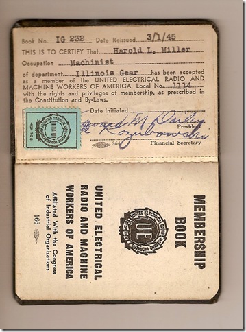 This week’s attic find is a dues book for my grandfather, Harold MILLER. At one point, he was a member of the United Electrical Radio & Machine Workers of America, Local 1114 (likely in Chicago). This particular book was issued on 1 March 1945.
