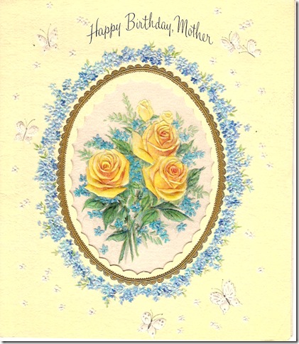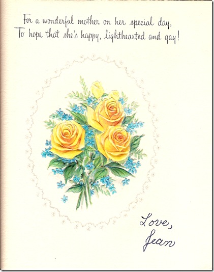 My grandmother would be celebrating her 89th birthday on April 29th. This is a birthday card that my mom gave my grandmother many years ago. I’m not sure exactly when, as there is no copyright date on the card, but I’m guessing that my mother was a child. My mother has beautiful handwriting, even during her adolescent years. The signature is either her early handwriting or perhaps it was said for her by my grandpa. That said, this card was likely given to her between 1947 and 1962. Care to clear this up, Mom?
