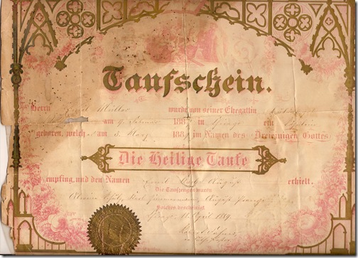This is a baptism certificate for my great-grandfather, Emil Charles MILLER. The document is 120 years old and is in written in German.